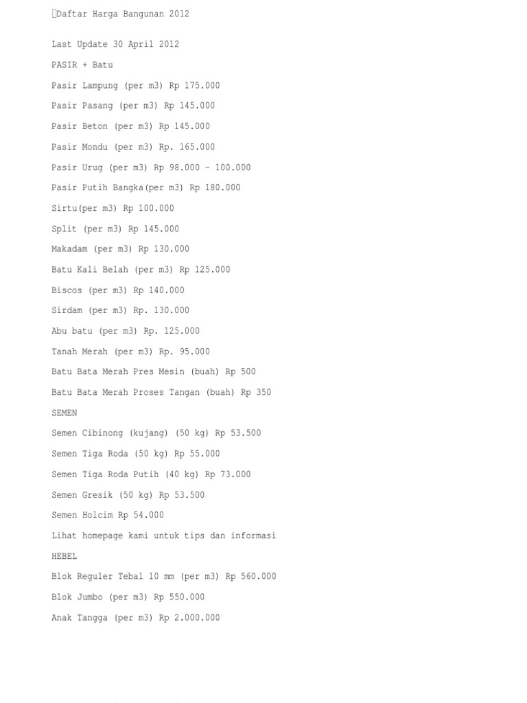 Namun kadang cukup sulit untuk mendapatkan harga yang efisien. Faktor utama kos rumah atau harga rumah meningkat ialah aktiviti jual beli oleh broker hartanah, kedua faktor bahan binaan yang tinggi, kos upah dan kos. Harga material bangunan 2012 versi ud cokro joyo. Untuk menyusun anggaran suatu konstruksi bangunan juga diperlukan daftar harga. Data series subyek harga perdagangan besar juga dapat diakses melalui fitur tabel dinamis. Info harga bahan bangunan, spesifikasi dan tips bangunan. This page contains information about harga bahan bangunan 2012 at jasa pemborong, mandor, tukang, bangunan, kontraktor, di solo sragen karanganyar blog. Daftar harga bahan bangunan yang saya tulis dalam blog ini sifatnya sebagai info dan acuan untuk membantu membuat anggaran atau estimasi dalam membangun dan merenovasi rumah. Produk kami informasi lebih lanjut, anda bisa datang ke kantor pemasana kami yang beralamat di komplek leuwigajah jaya no. Data series subyek harga perdagangan besar juga dapat diakses melalui fitur tabel dinamis. Kami membuka peluang kepada semua toko bahan bangunan di seluruh indonesia untuk kami iklankan di www.abproperty.tk bila membantu kami dengan daftar harga2 di toko bahan bangunan anda. Daftar harga bahan bangunan cat tembok a. Cara kurang harga rumah adalah antara isu yang hangat tahun 2012 dan tahun akan datang sekiranya kerajaan tak campur tangan mengatasi harga rumah yang semakin meningkat ketika ini.