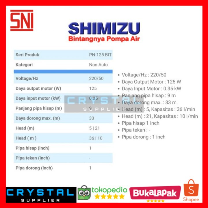 Daya hisap yang mampu dioptimalkan maximum 9 meter. Dimensi (p x l x t) 47.5 cm x 22.5 cm x 21 cm. Pompa ini mampu mengisap air sedalam 9 meter dengan kapasitas listrik 125 watt. Anda bisa mencari produk ini di toko online yang mungkin jual pompa air 125 watt. Harga otomatis pompa air shimizu 125watt ps135e / ps130bit asli.